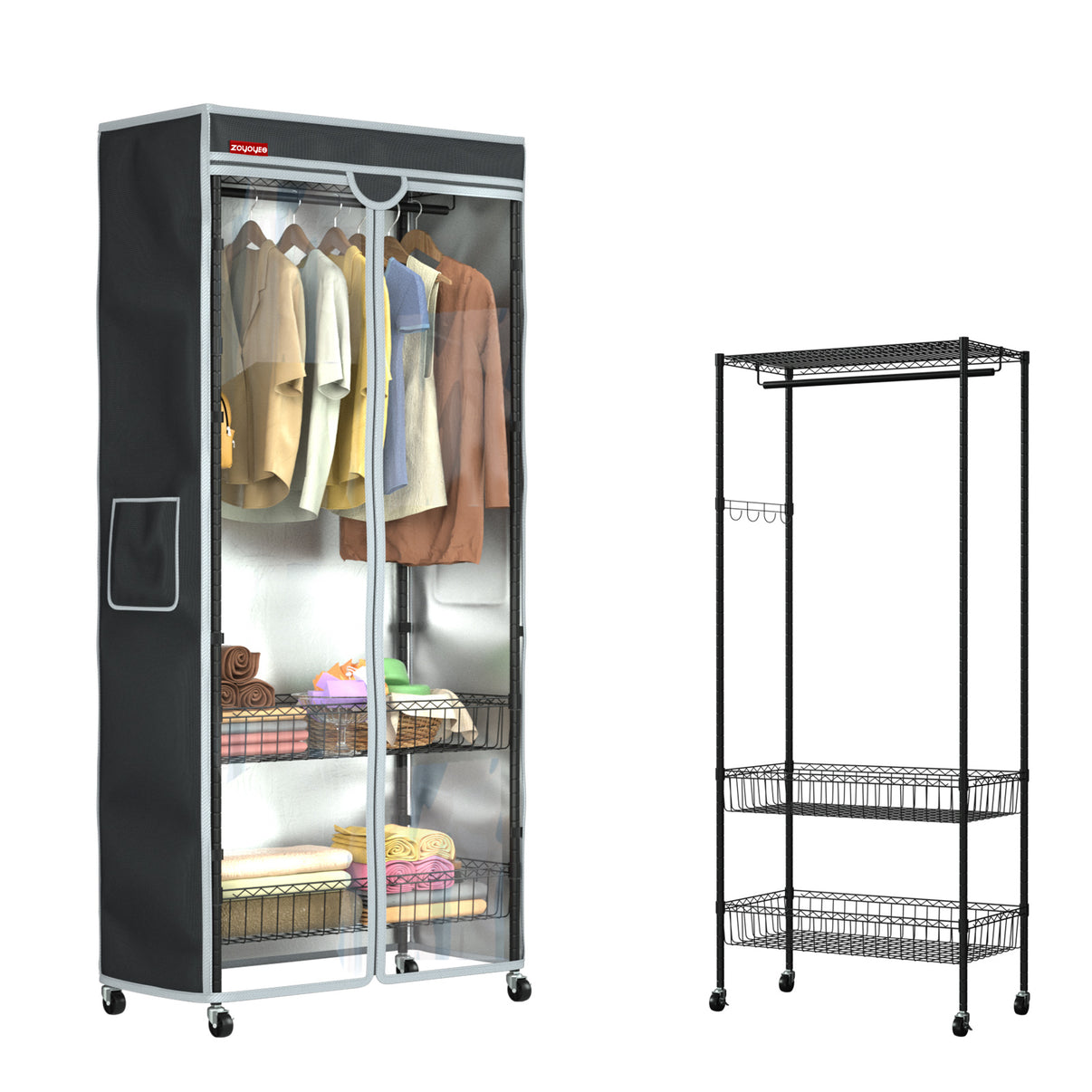 Wire Clothes Rack with Cover,Heavy Duty Garment Racks with Wheels,Closet Wardrobe with Transparent front Cover,Rolling Clothing Rack with Adjustable Basket and Side Hook,15.8" Dx31.5 Wx72.1 H